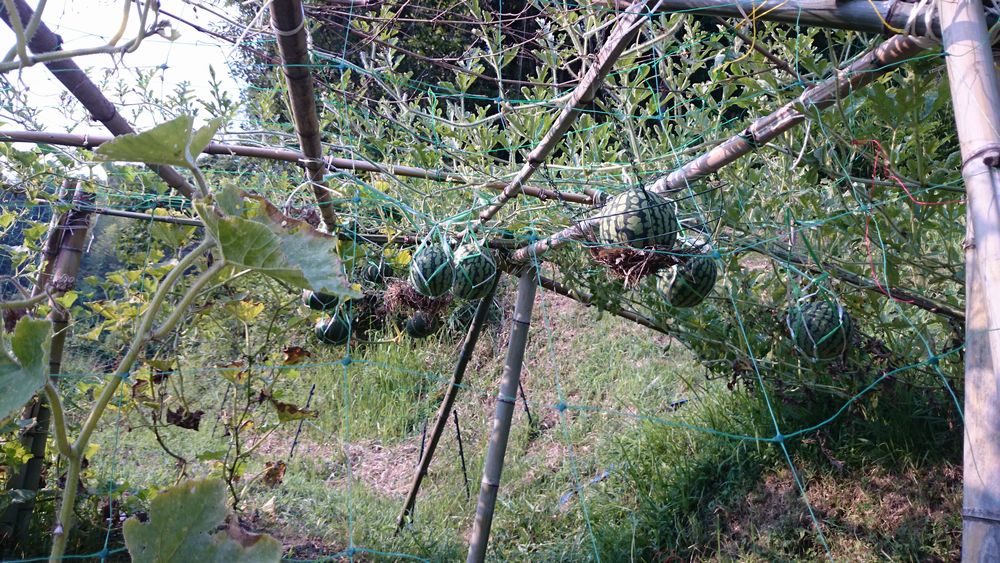 スイカの空中栽培です。