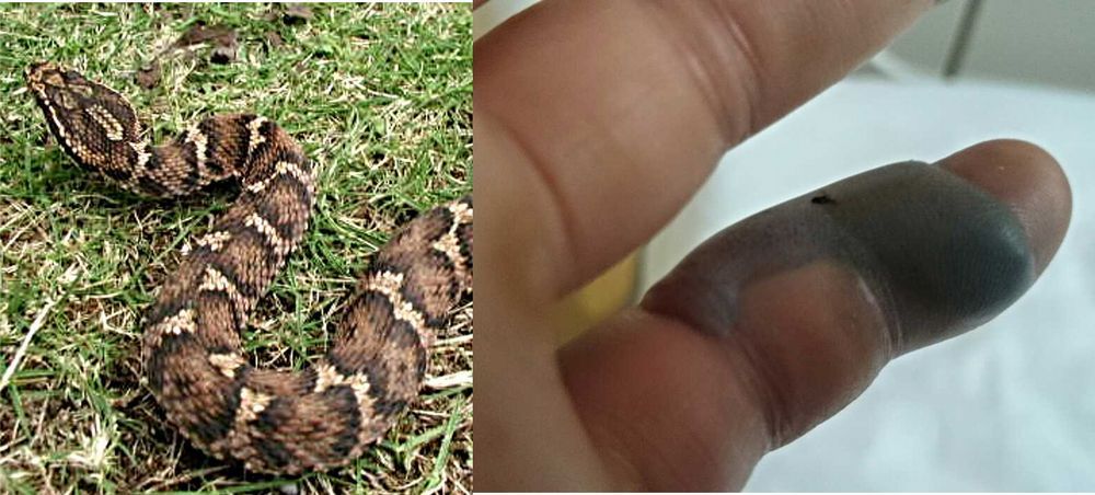 六角形の模様のある蛇はマムシです。幸い命は守れましたが、咬まれると大変です。