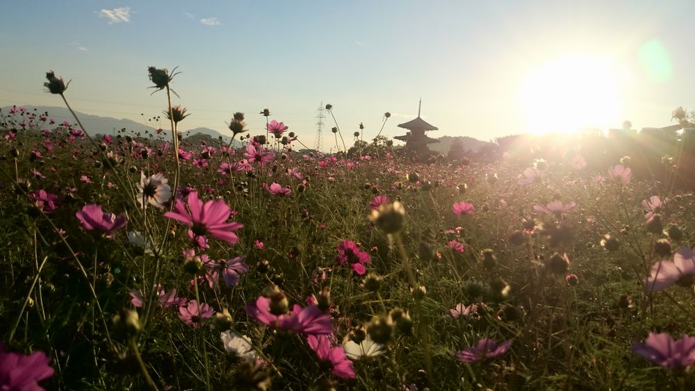 夕焼けにコスモス、背景には世界遺産